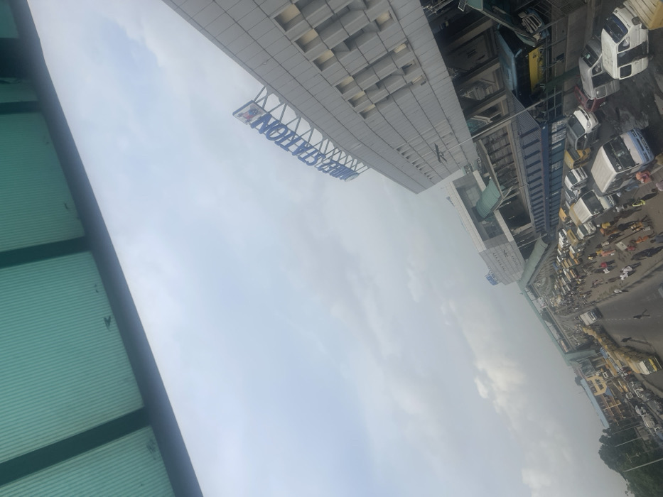 The photo is an angled, low-angle shot focusing on a gray building. "ROBERTS STATION" is visible on the building's exterior. Below the building is a busy street scene with several white vans, people, and construction cranes. The sky is mostly overcast. A green awning is visible in the lower left corner of the image.