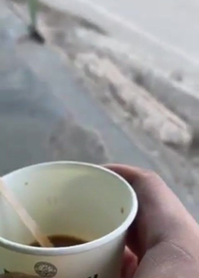 hand holding a white paper cup with a small amount of dark liquid inside, likely coffee