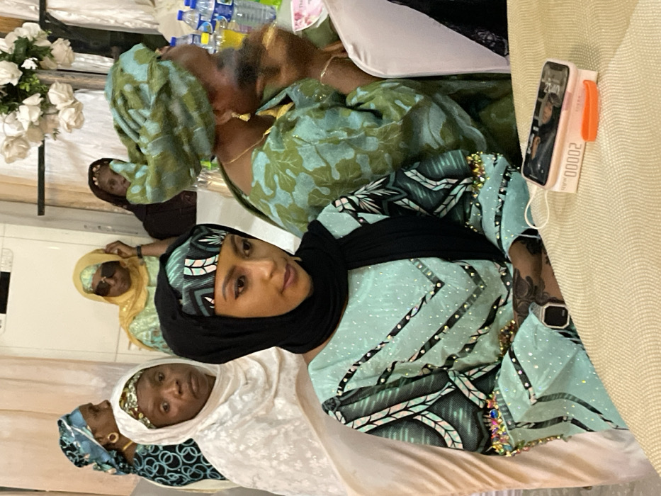 Several women are seated together, seemingly at an event. All the women are wearing different coloured headscarves and clothing, some are decorated with patterns and embellishments. There are white flowers and bottles of water in the background. A mobile phone attached to a power bank with 20,000 mAh is visible, it appears to be charging.