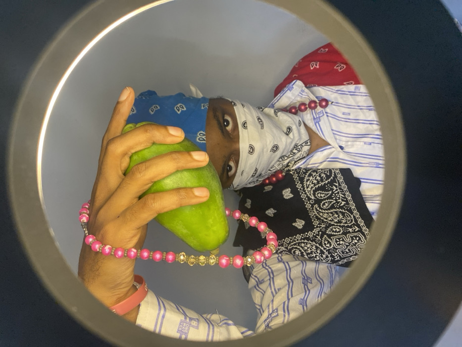 An individual is depicted in Ngleshi Amanfro, Ghana, positioned centrally within the circular frame of a ring light. The person's dark-skinned hand is raised, holding a large, oblong green fruit, resembling an unripe mango or papaya, horizontally above their head. A long necklace with alternating pink spherical beads and gold-toned faceted beads hangs from the wrist, extending downwards on the left side. The individual's face is partially obscured by a white bandana with a black paisley pattern, covering the nose, mouth, and chin. The eyes are visible and directed towards the viewer. A blue bandana with a white paisley pattern is worn on the head, visible above the forehead. The person wears a collared button-up shirt; the left portion is white with thin blue vertical stripes, while the right portion features a red fabric with white patterns. A black bandana with a white paisley pattern is draped over the left shoulder. A pink wristband is present on the left wrist. Another necklace, composed of reddish-pink spherical beads, is visible on the right side of the neck. The background consists of a plain light blue wall.
