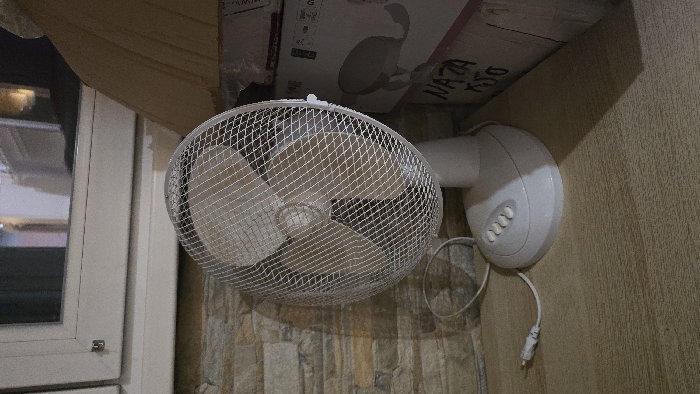 The scene depicts an indoor environment, asserted to be in Pleven, Bulgaria. No specific visual identifiers within the image directly confirm this geographical location. A white electric desk fan is positioned centrally on a light-colored, wood-grain patterned surface, likely a desk or shelf. The fan features a white circular mesh guard enclosing several fan blades, and its white conical base includes a control panel with four light-colored oval-shaped buttons. A white electrical cord, terminating in an unattached two-prong plug, extends from the fan's base towards the lower-left of the frame. The fan is stationary. Behind the fan, a wall is visible, with its lower section covered by a light brown and grey multi-toned simulated stacked stone veneer. Above this, a white PVC window frame is present, reflecting an indistinct interior or exterior scene. To the immediate right of the fan, several corrugated cardboard boxes are stacked. One visible side of a box displays dark handwritten text, including "NATA" and "K50". No individuals or living subjects are present in the image.