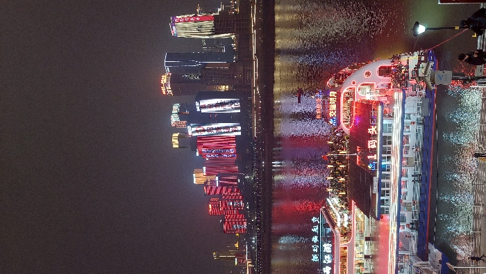 Night scene shows a cityscape reflected in water. Skyscrapers adorned with colorful lights line the waterfront. A large illuminated boat is docked, its lights creating streaks across the water's surface. The overall atmosphere is vibrant and modern, with the reflections enhancing the visual impact. Figures walk on the promenade.