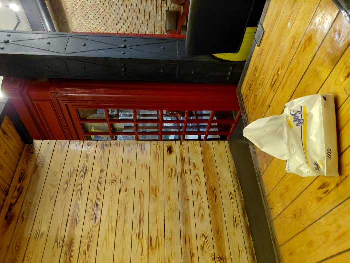 A restaurant booth features a red telephone box design. A black metal beam runs above. The seating is black with a yellow accent. The table, made of light brown wood planks, holds a white tissue box with blue and yellow writing. Walls of the booth are made of similar light brown planks.