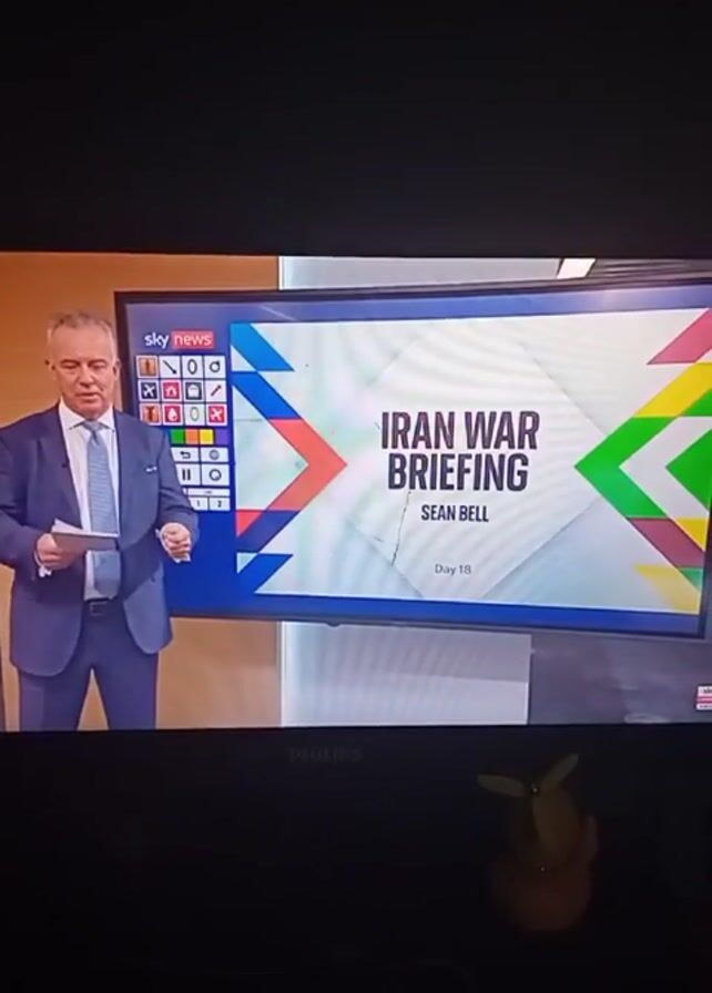television screen displaying a Sky News broadcast. The broadcast is an "Iran War Briefing" with Sean Bell as the presenter. The graphic on the screen indicates that it is "Day 18." There's a man in a suit on the left side of the screen who appears to be Sean Bell, and a faded picture of Donald Trump is visible briefly on the right. In the foreground, underneath the television, there's a small yellow figurine. The TV is a Philips brand. The background surrounding the TV is dark.