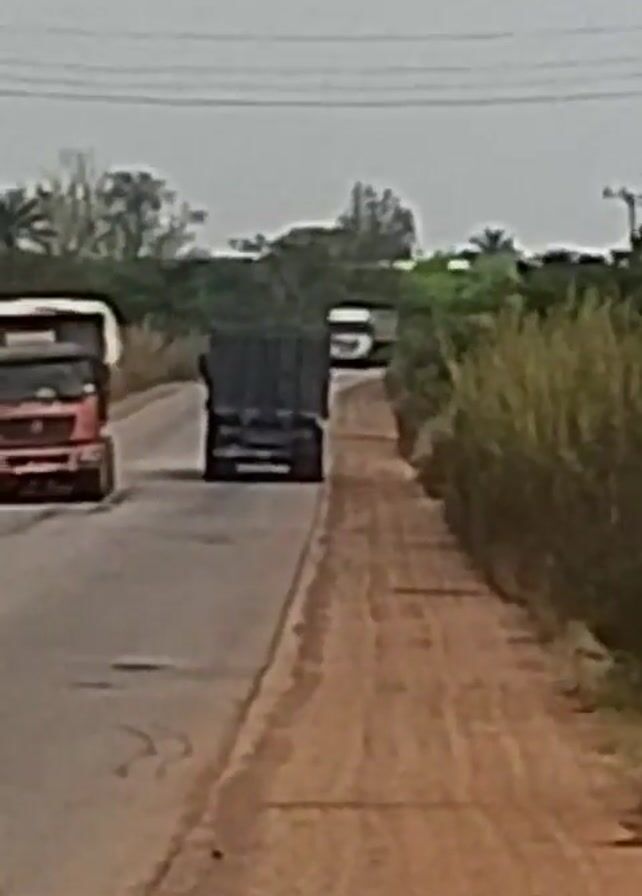 two trucks driving on a rural road. A third truck is visible further down the road. The first truck is red and the second truck is dark blue. The road is asphalt and has a shoulder on either side. There are trees and vegetation on both sides of the road. There are power lines above the road. The weather is overcast.