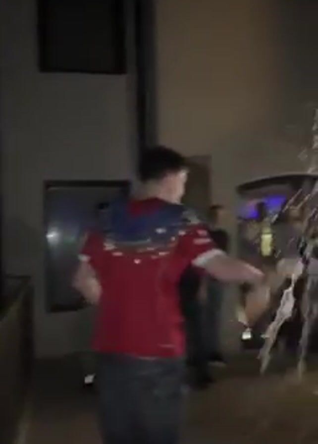 A young man in a red and blue shirt and jeans is opening a bottle of champagne in front of a group of people. He is holding the bottle with both hands and shaking it vigorously, causing the champagne to spray out. The people behind him are watching and cheering. The event takes place on a patio or balcony with a metal railing, outside a building at night.