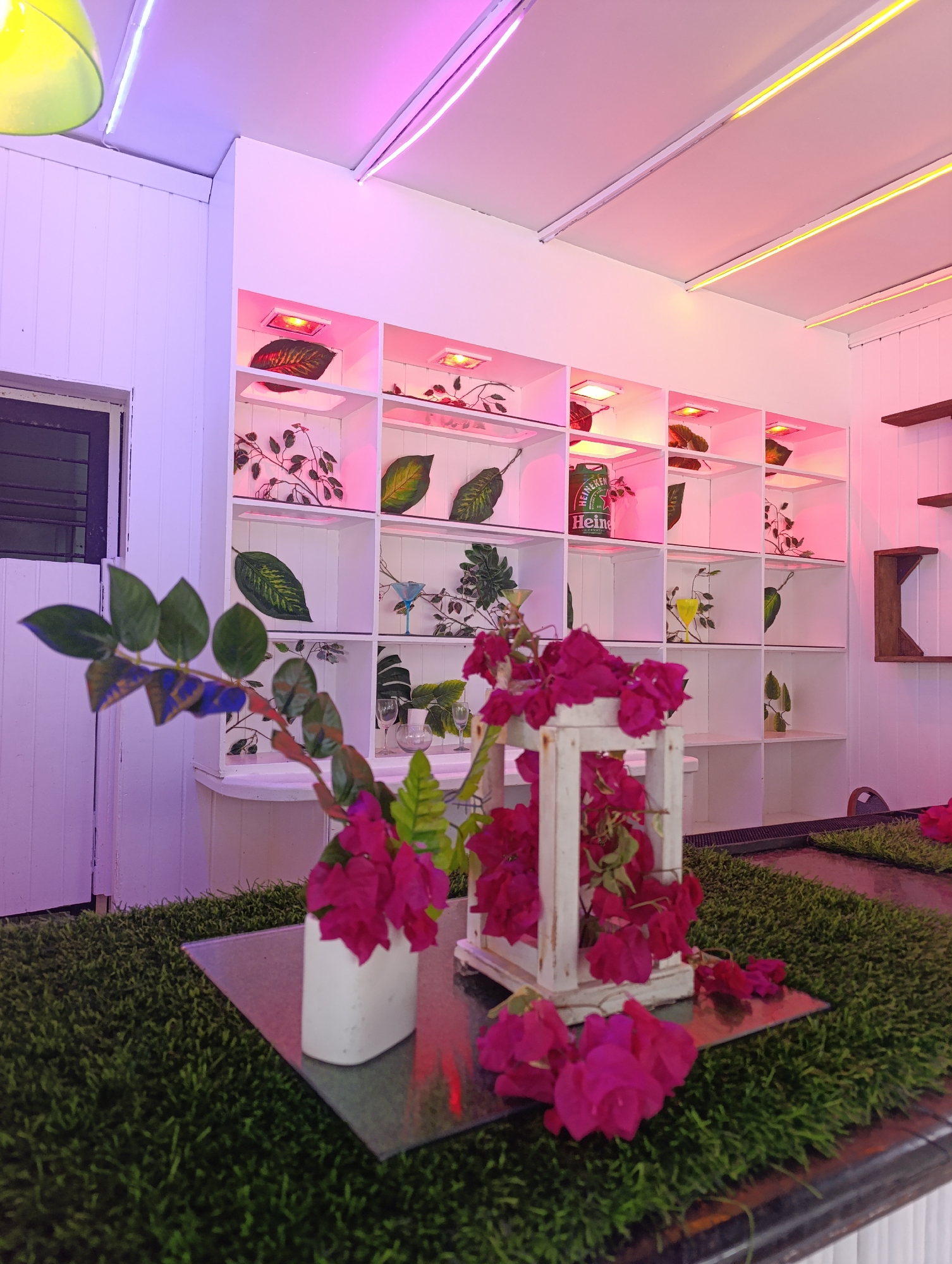 The image presents a room decorated with a modern, plant-centric design. In the background, a white shelving unit with square cubbies displays various plants and decorative items under pinkish-red lighting. In the foreground, a table covered in artificial grass serves as a platform for floral arrangements. A white ceramic vase and a distressed white wooden frame are adorned with vibrant pink bougainvillea flowers. The overall ambiance suggests an indoor setting, possibly a restaurant or event space, marked by contemporary aesthetics and a focus on greenery. The city and exact location are unknown.