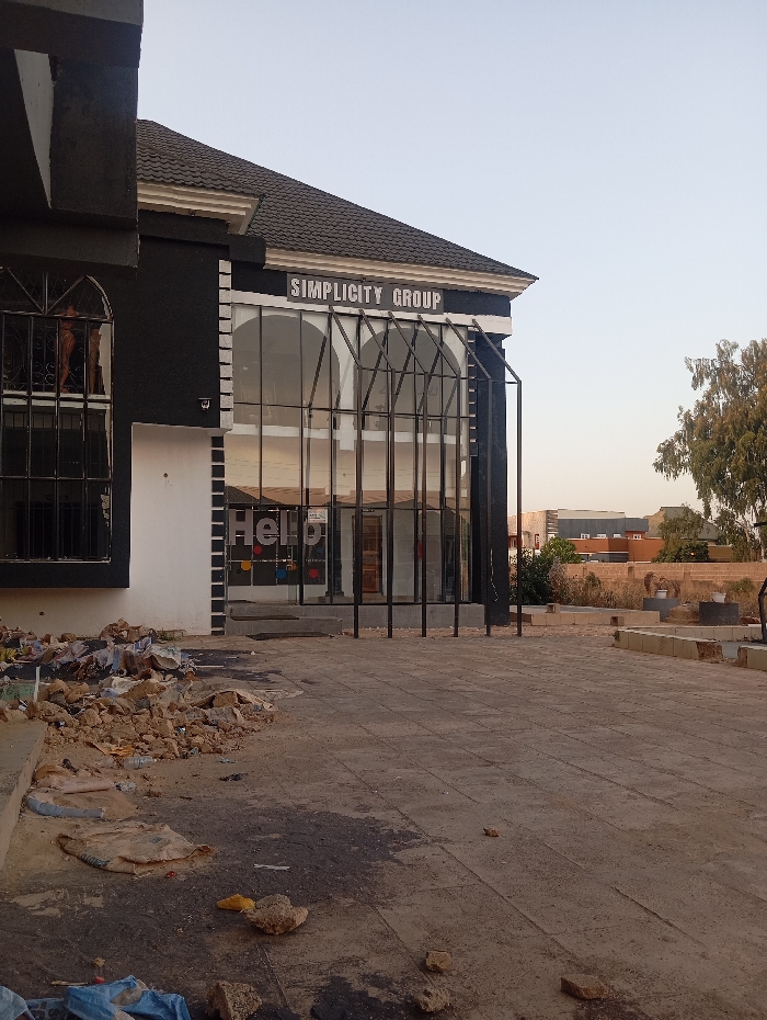 The image displays an exterior view of a two-story commercial building in Jos, Nigeria, featuring a dark-colored facade with white trim and a dark tiled hip roof. A prominent sign above the ground floor reads "SIMPLICITY GROUP." The lower level presents a large, arched glass facade with black vertical supports, through which a multi-colored sign partially displaying "Help" is visible inside. To the left, a section of the building includes a rectangular window fitted with dark metal grilles. The foreground consists of a paved area, heavily covered on the left side with piles of soil, rocks, torn fabric sacks, and general debris, indicating recent disturbance or neglect. Scattered detritus is also present across the broader paved surface. The background reveals a clear, light sky, a tree with sparse foliage on the right, and faint outlines of distant urban structures. No individuals are depicted.