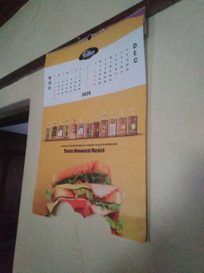 calendar advertising bread, likely from a brand named "Festive." The calendar features the months of November and December of 2025. It displays a row of assorted breads available in white and brown, followed by the slogan "Taste Hauwezi Resist," and a large image of a sandwich. The calendar is hung on a wall.