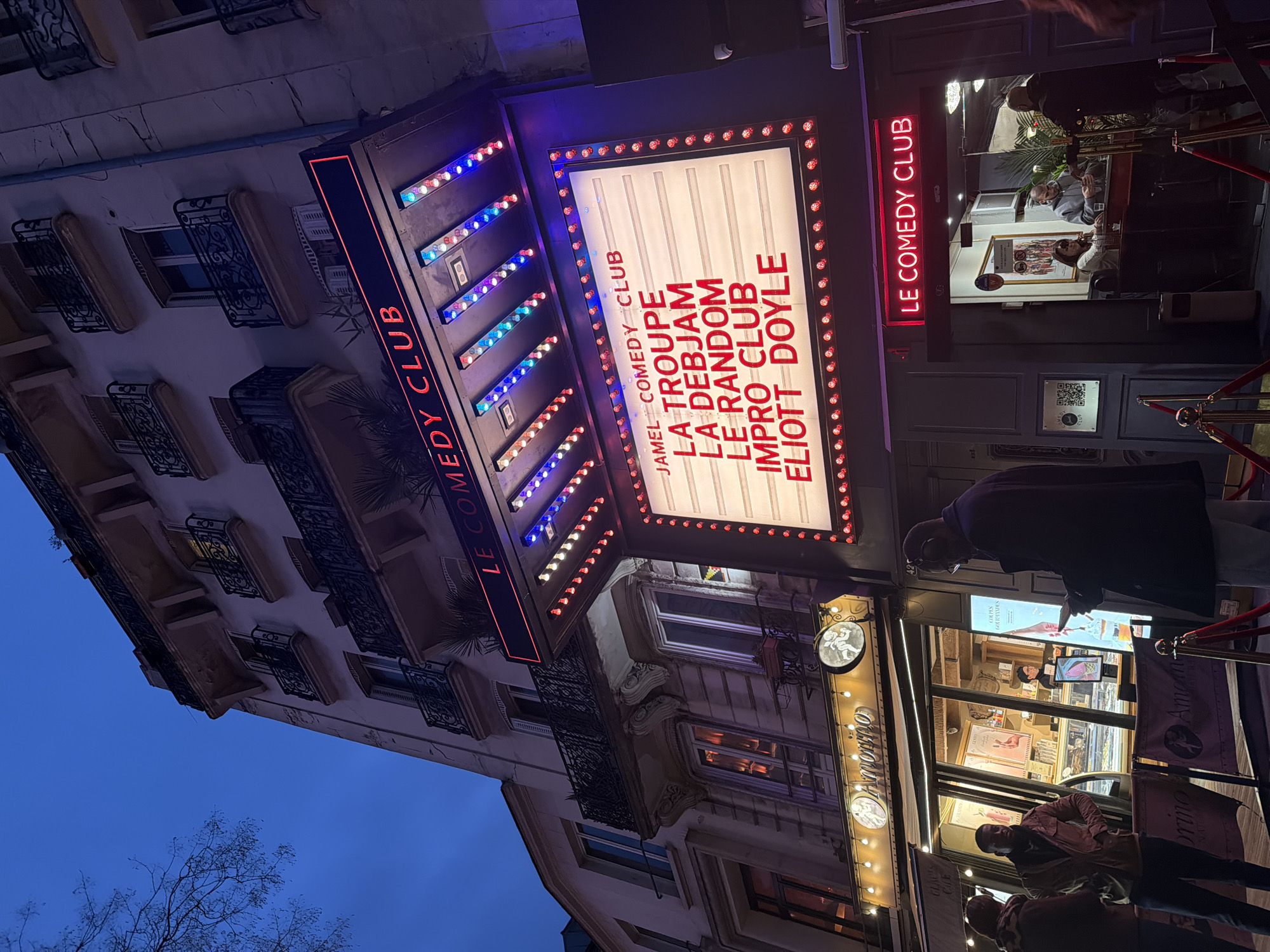 This image depicts a nighttime street scene at 42 Boulevard de Bonne Nouvelle, 75010 Paris, France, showing the illuminated facade of "LE COMEDY CLUB" and an adjacent "Amorino" shop. A multi-story Parisian building with a light-colored stone facade and dark, ornate wrought-iron balconies on its upper floors dominates the background against a dark blue sky, partially obscured by bare tree branches on the left. The main subject is "LE COMEDY CLUB," identified by a large, illuminated marquee. The marquee displays "LE COMEDY CLUB" in red neon lettering at the top, followed by rows of small, multi-colored lights (red, blue, white). The central panel is a light-box presenting a performance schedule in red lettering: "JAMEL COMEDY CLUB," "LA TROUPE," "LA DEBJAM," "LE RANDOM," "IMPRO CLUB," and "ELIOTT DOYLE." The marquee is bordered by numerous small, red circular lights. To the right of the marquee, the club's entrance is marked by a red neon "LE COMEDY CLUB" sign. Inside the open entrance, a counter is visible where a woman is seated and a man in a grey hoodie stands behind it, interacting with another man in a dark coat to the right. Red velvet ropes with gold stanchions define a queuing area leading into the club; a QR code is affixed to the wall beside the entrance. To the left of the club entrance is the brightly lit storefront of "Amorino," an ice cream and coffee shop. Its windows display products and an interior with a staff member visible behind a counter. String lights are strung above the shop's entrance. Outside Amorino, two individuals are seen conversing on the left. A third individual, a man in a dark coat wearing headphones, stands to the right, engaged with a handheld electronic device. Red velvet ropes and gold stanchions also line the pavement in front of Amorino.