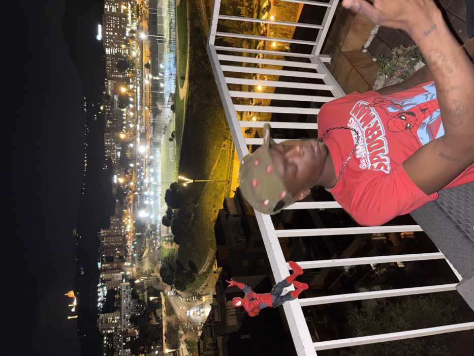 The image presents a nighttime scene from a balcony overlooking an urban landscape in Barcelona, Spain. In the foreground, a blurred male individual is seated on a dark outdoor chair, facing slightly to the right. He wears a red t-shirt featuring "The Amazing Spider-Man" graphic, a silver chain, and an olive green cap with red polka-dot-like patterns. His left arm, visible, shows a tattoo, while his right hand is partially cropped at the edge of the frame. To his left, a red and blue Spider-Man action figure is perched on the white metal balcony railing, posed as if climbing or web-slinging with one arm raised. The background reveals a vast, illuminated cityscape under a dark sky. Immediately below the balcony, residential buildings and a winding road with vehicle lights are visible. Further into the mid-distance, several brightly lit sports fields, including soccer/football and padel courts, are present, surrounded by additional residential buildings and urban infrastructure. In the far distance on the left horizon, the distinctly illuminated Temple Expiatori del Sagrat Cor on Tibidabo mountain is visible, confirming the Barcelona location. The overall environment is one of an active city at night, viewed from an elevated residential perspective.