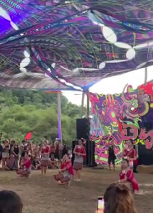 A group of young women are performing a coordinated dance routine in front of a crowd of people. They are wearing traditional clothing consisting of red tops and patterned skirts. They have their hair up and adorned with white flowers. The dance is taking place in a grassy area under a large, colorful canopy. Behind the dancers is a stage with speakers and a vibrant, psychedelic backdrop. The crowd is a mix of ages and genders, some of whom are recording the performance on their phones. The environment suggests an outdoor festival or event. In the background, there is a lush green hillside.