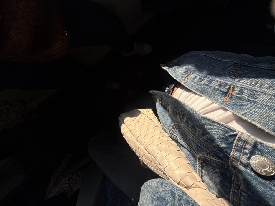 A cream-colored woven handbag rests against a denim jacket and jeans, with a glimpse of a white shirt underneath. A button is visible on the jacket, along with brown stitching. The scene is split by contrasting light and deep shadows. In the obscured areas are vague suggestions of a brown bag, a patterned item, and shoes.