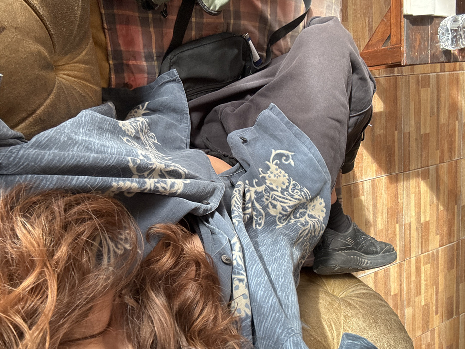 The image displays a high-angle view of an individual reclining indoors in Tambon Ko Tao, Thailand. The person has long, wavy, reddish-brown hair and is wearing a blue shirt with beige ornamental patterns, dark grey trousers, and a dark athletic shoe on the visible foot. A small black bag, containing what appears to be a lighter and pen, rests next to their hip on a plaid surface. The individual is resting on a tufted brown upholstered surface, likely a sofa or cushion. In the upper left background, a plastic water bottle sits on a small wooden table. The flooring consists of light brown rectangular tiles, illuminated by strong natural sunlight casting distinct shadows.