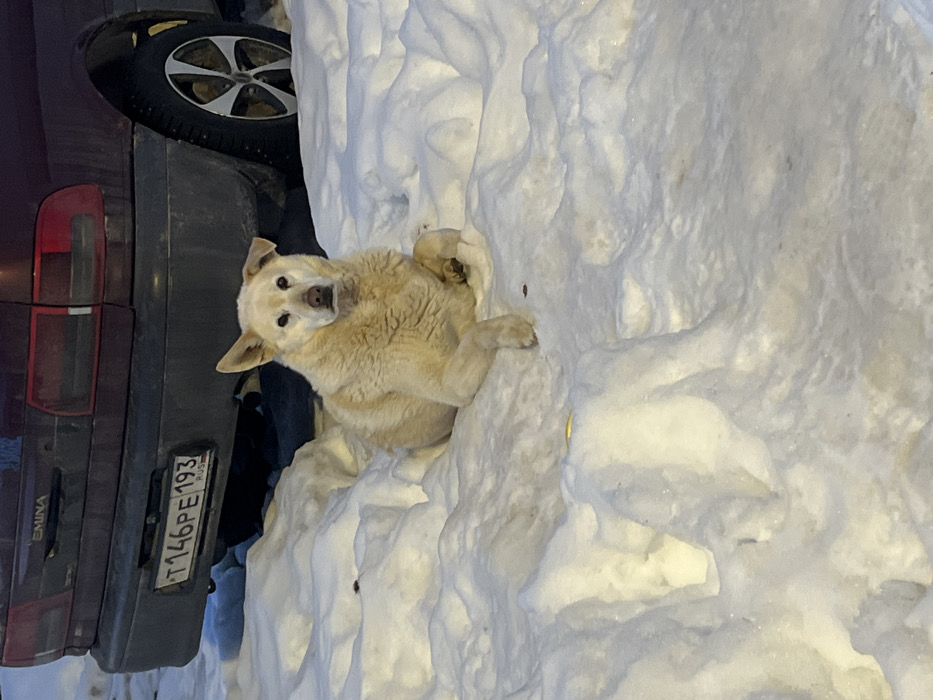 - "In the city of Раздолье, Russia, an outdoor scene depicts a light-colored dog resting in deep snow in front of a parked car" by FM-bcX6F2, licensed under CC BY 4.0