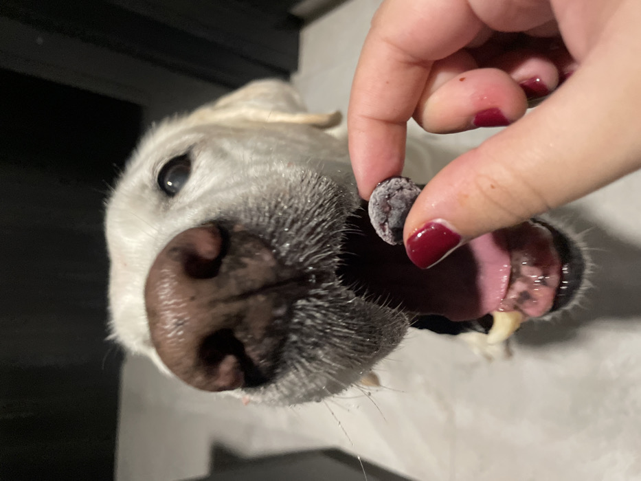 - "The scene depicts a close-up, low-angle view of a light-colored dog, likely a Labrador Retriever, being offered a single frozen blueberry by a human hand" by FM-ckPo02, licensed under CC BY 4.0