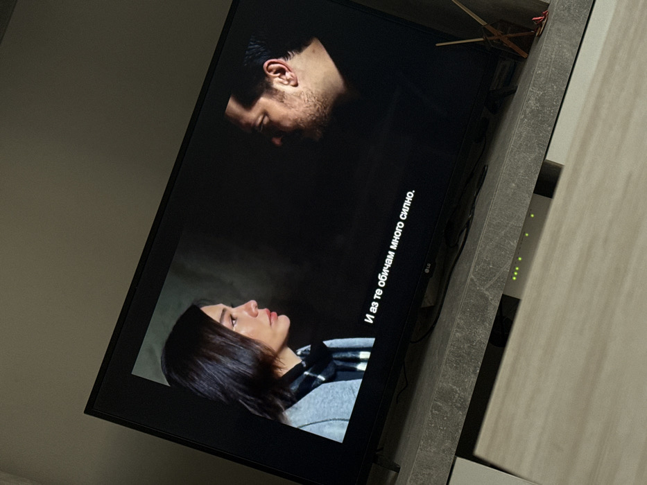 A photograph depicts a television screen displaying a program, set within a residential interior in Dobrich, Bulgaria. The image is taken at an oblique angle, rotated counter-clockwise. The television is a flat-panel LG brand unit with a black bezel, resting on a textured grey, possibly concrete-effect, media console. Beneath the television, in a recessed shelf of the console, an electronic device with four illuminated green indicator lights is visible. To the right of the screen, a small, light-colored wooden decorative object is partially visible on the console. The wall behind the television is a plain, light, neutral color. On the television screen, two individuals are shown in a close-up shot, facing each other in profile against a dark background. On the left, a woman with dark, shoulder-length hair wears a light grey jacket over a dark, possibly striped, scarf or garment. Her expression is somber. On the right, a man with dark hair and a beard is depicted in shadow. White Bulgarian subtitles are present at the bottom of the screen, reading: "И аз те обичам много силно." which translates to "And I love you very much." The room lighting is dim, with the television screen being the primary light source.