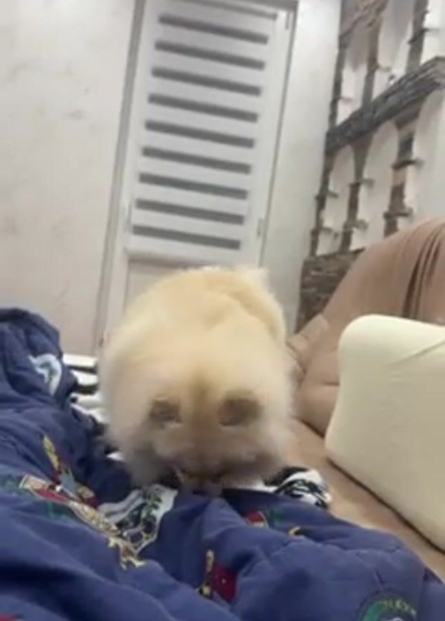 small, fluffy, light-colored Pomeranian dog standing on a blue comforter with designs on it