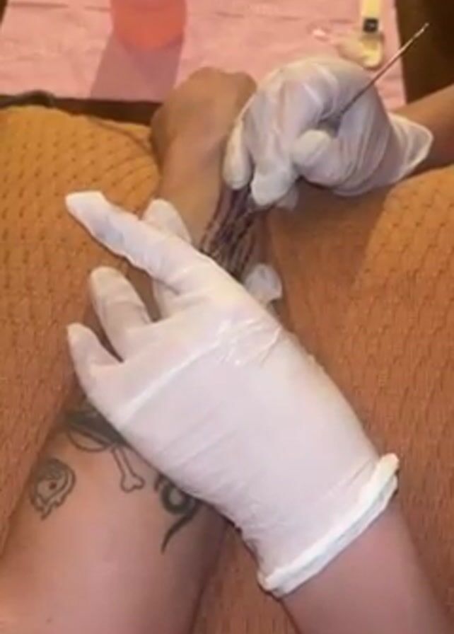 The scene depicts a person getting a tattoo on their wrist. The person receiving the tattoo has other tattoos on their arm, including a skull and crossbones design. The tattoo artist is wearing white gloves and using a needle to apply the tattoo. There is a pink disposable pad below, and a bottle of what appears to be cleaning fluid is visible next to the wrist.