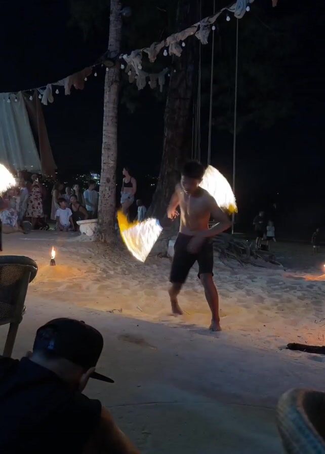 Here is a brief description of the video: Two shirtless young men perform a fire dance on a beach at night. They are holding flaming objects and twirling them around. In the background, a crowd of people watches the performance. String lights hang above, adding to the festive atmosphere. A person wearing a black hat is seated in the foreground, observing the performance.
