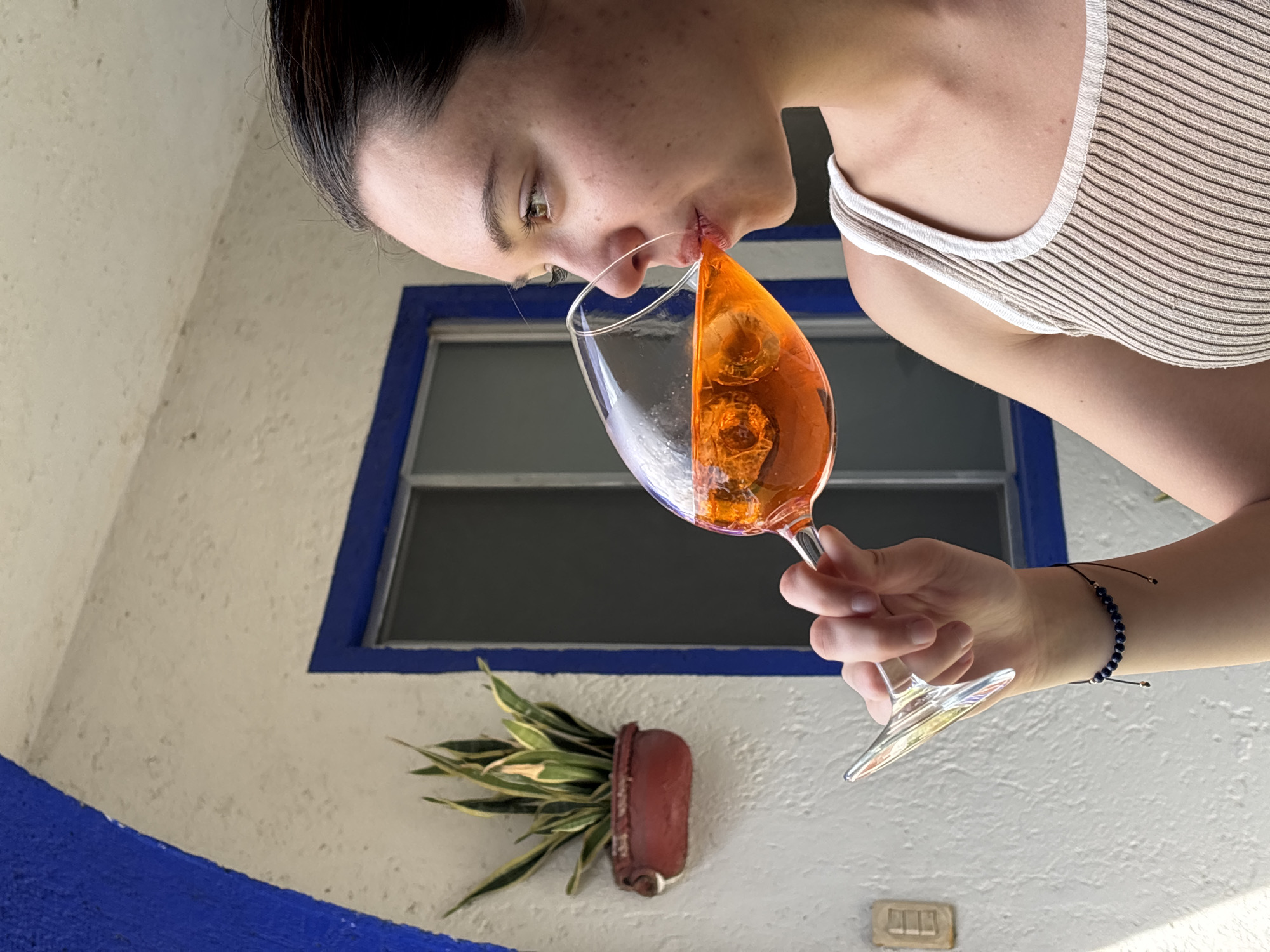 A woman with dark hair and fair skin sips from a stemmed wine glass filled with an orange beverage, likely a Spritz, held in her right hand