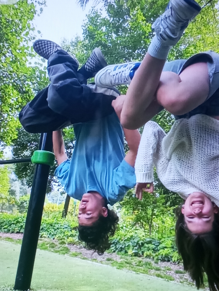 - "Two young individuals are depicted hanging upside down at an outdoor recreational area in what is identified as Kasagaran, Uzbekistan" by FM-1o2DD3, licensed under CC BY 4.0