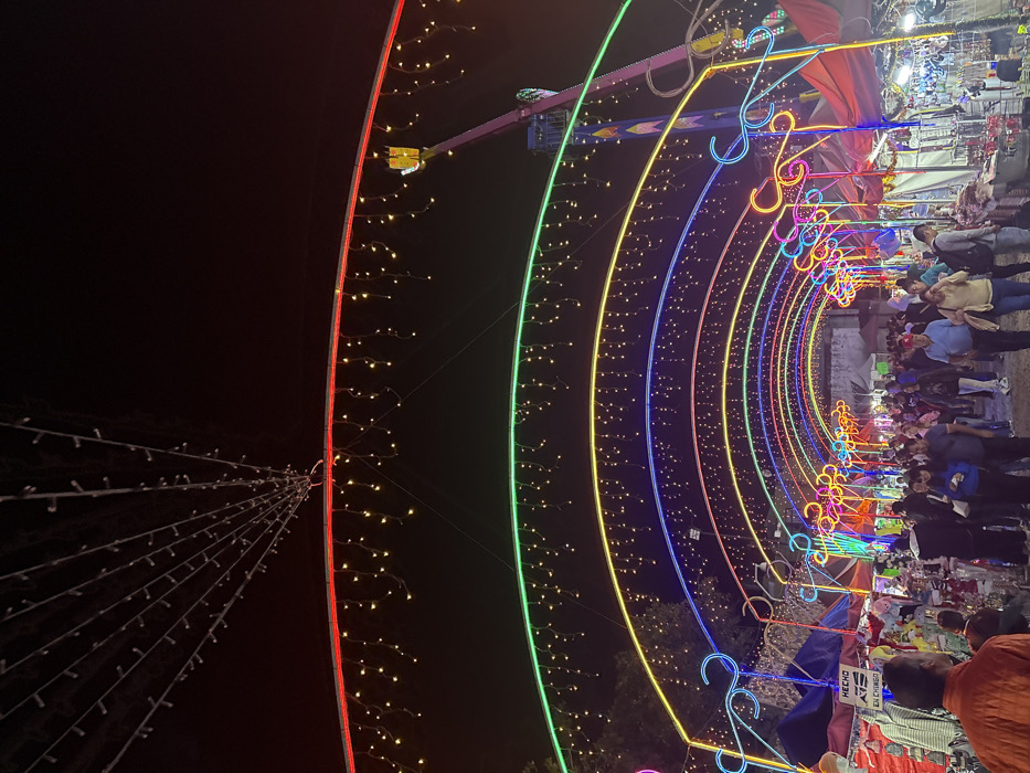 An amusement park scene features rainbow-colored, arched lights lining a bustling pathway filled with people