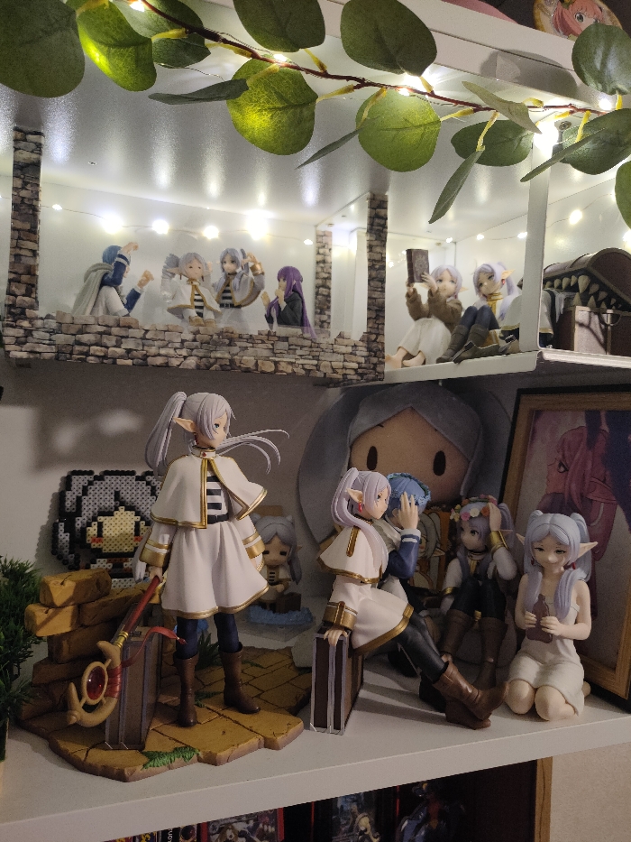 The image displays a meticulously arranged collection of anime-style figurines and related merchandise on two white display shelves, likely located within a personal residence in Sofia, Bulgaria. The upper shelf, set further back, features a diorama-like arrangement with a white background illuminated by small, warm-toned LED string lights. Two decorative pillars, designed to resemble stacked stone, frame a central area. Within this area, several smaller figurines are posed: a blue-clad male figure interacts with two light-haired female figures on the left. On the right, a purple-haired female figure stands near a light-haired female figure seated and reading a book, beside another light-haired figure in dark attire. To the far right, a brown, open treasure chest prop with visible teeth details is positioned. A string of artificial green leaves with integrated lights drapes across the top of this shelf from an unseen higher surface. The lower, more prominent shelf showcases larger figurines. From left to right: 1. A tall, slender female figure with long silver hair styled into a high ponytail and prominent elf-like ears. She wears a white and gold cape, a striped top, dark pants, and boots, standing on a tan, tiled base. She holds a staff-like object with a red accent. Small, stacked brown block props are next to her on the base. 2. A female figure with silver hair and elf ears, wearing a white and gold cape, is seated on a brown suitcase. She leans forward, appearing to interact with a blue-clad figure whose head is partially visible. 3. A smaller female figure with elf ears, dark clothing, and a floral headband is seated. 4. A female figure with light purple/silver hair and elf ears kneels, wearing a light-colored dress and holding a small brown bottle or flask. Behind the figurines on the lower shelf, a large, round plush character with two black eyes and a grey hood is visible. To the left, a pixel-art style perler bead artwork of a character's face is affixed to the wall. To the right, a framed picture depicts an elf-eared character, complementing the aesthetic of the figurines. The overall lighting is artificial and consistent with an indoor display setting.