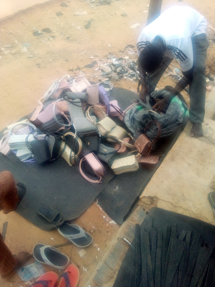 In an outdoor ground-level scene in Jushi, Nigeria, a male individual is depicted bending over, actively manipulating contents within a large, crumpled grey-green fabric bundle. This individual wears a white short-sleeved shirt with black stripes on the sleeves and dark trousers, and is barefoot. A dark grey mat or fabric covers a section of the sandy-dirt ground, serving as a display surface. Upon this mat, approximately two dozen small to medium-sized handbags and purses of various designs and colors—including light pink, beige, gold glitter, black, and light blue—are arranged. Partially visible at the bottom left is the lower leg of another individual, clad in brown. Several pairs of flip-flops, in black, black-grey, and red-blue, are scattered on the surrounding dirt ground and partially on the mat. To the far right, a stack of black, flat, rectangular items is visible on a light-colored concrete surface. The background consists of sandy-dirt ground with scattered debris and a vertical pole.