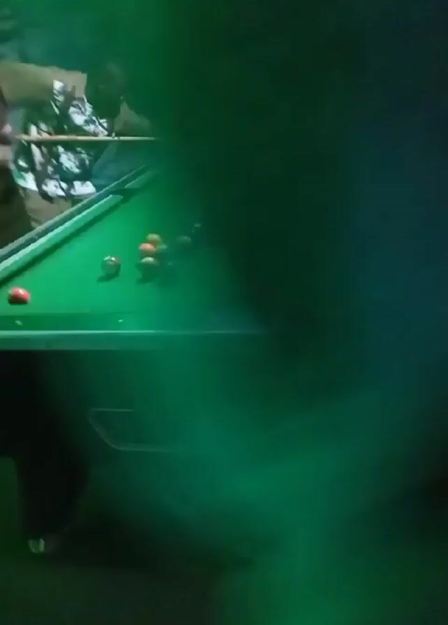 man playing pool. He stands on the left side of the table, cue in hand, aiming at the racked balls. The pool table is a standard size with green felt and black rails. Various colored pool balls are arranged in a triangle at the center of the table, with the cue ball positioned near the opposite end. The man wears a short-sleeved shirt with a light-colored floral pattern. The room is dimly lit, with a green hue illuminating the scene. Wooden pallets are stacked in the background, and a translucent plastic bag is visible underneath the pool table.