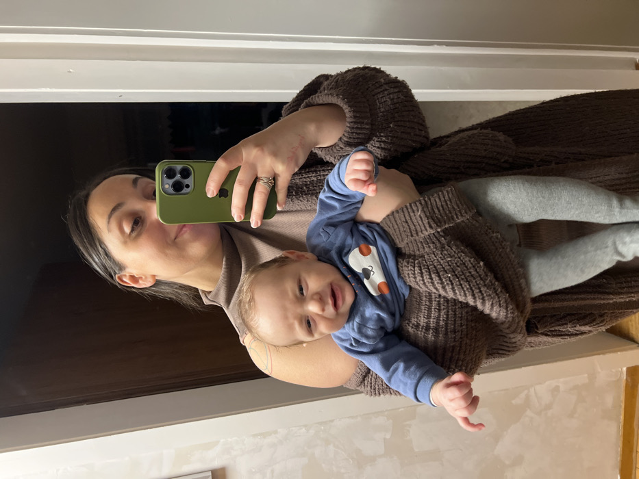 A person is taking a selfie while holding a baby. The person is wearing a brown sweater and a tan turtleneck. The baby is wearing a blue shirt and gray pants. The phone is olive green. The background appears to be inside a home, with a white door frame visible. The image is slightly tilted to the right.