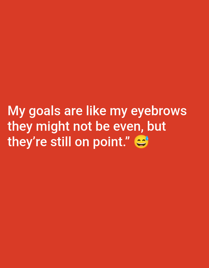 The scene is a digital graphic featuring white sans-serif text on a solid reddish-orange background. The text, positioned centrally in the lower frame, reads: "My goals are like my eyebrows they might not be even, but they're still on point." An emoji, a yellow smiling face with two small blue sweat drops above its right eyebrow, follows the text. No discernible real-world objects, people, or actions are depicted. The graphic is presented in the context of Festac Town, Nigeria.