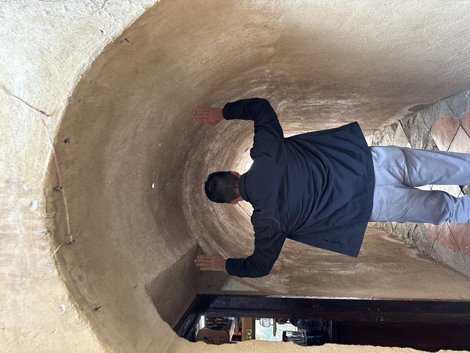 A person stands inside a cylindrical structure, possibly a tunnel or well. The walls are rough, beige-colored, and curved, with visible seams or construction joints. The person wears a dark jacket and light-colored jeans, with their arms outstretched, touching the walls. Outside the tunnel's opening, patterned tiles are visible, and glimpses of an interior space with furniture or objects are seen through a doorway. The photograph appears to be taken from within the structure looking outwards.