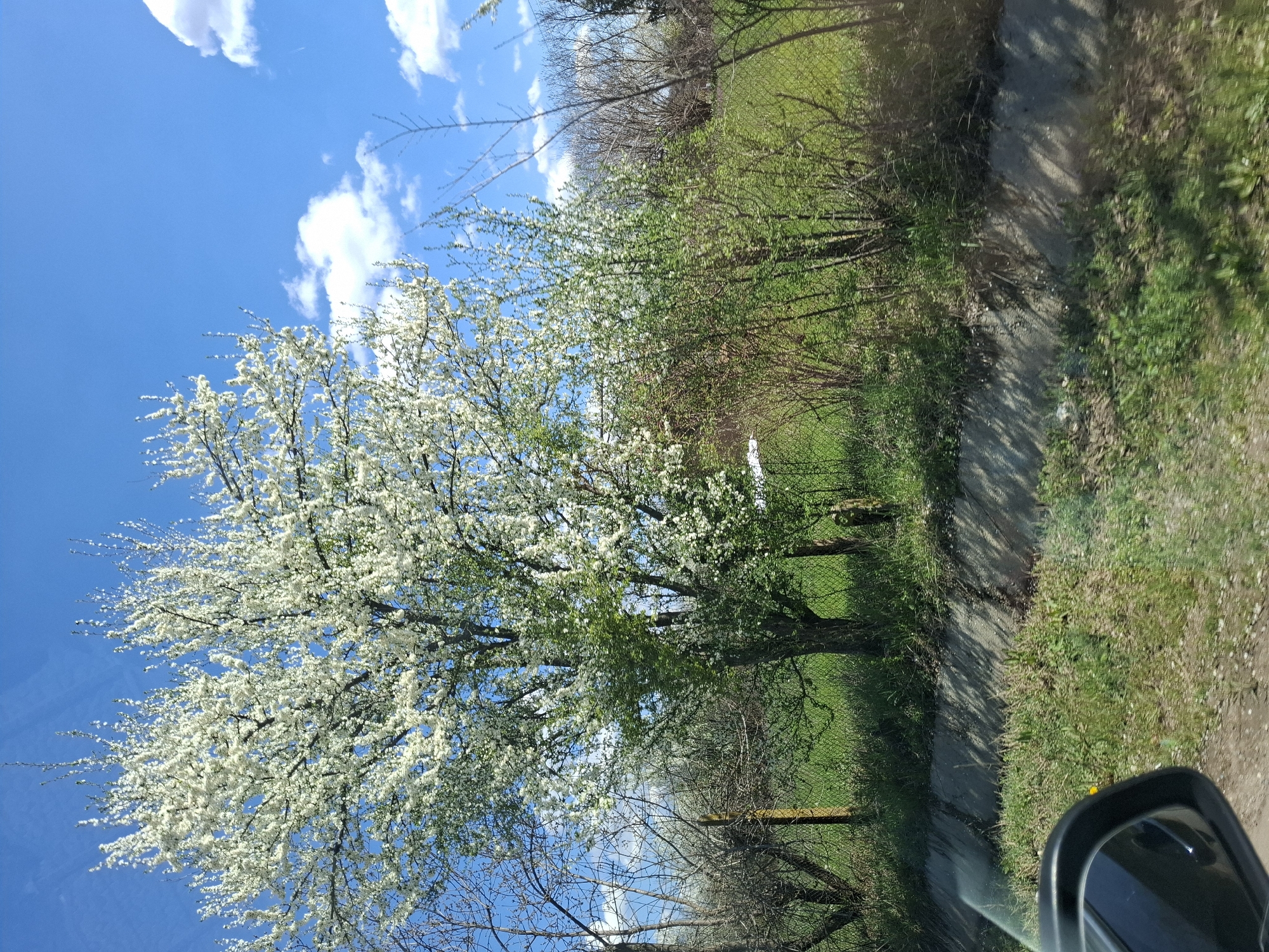 The image depicts a rural scene in Blagovo, Bulgaria. A tree with white blossoms dominates the left side of the image, set against a blue sky with scattered clouds. To the right, a narrow dirt path runs alongside a fence, separating the path from grassy terrain with shrubs and trees. The ground appears to be a mixture of grass, dirt, and some debris. The scene is viewed from a slightly elevated perspective, possibly from a vehicle, as a side mirror is visible in the bottom right corner.