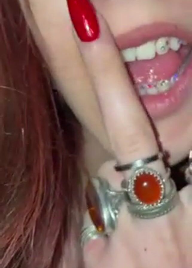 A woman is showing off an inner lip tattoo that says "$EXY". She has braces with rhinestones. She has red manicured fingernails and many rings on the hand she is using to pull open her lip. She is wearing a red top and has many necklaces. The background is a cluttered room with red fairy lights.