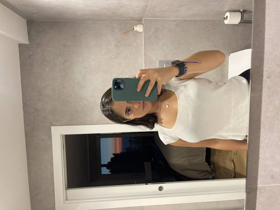 A woman in a white ribbed tank top takes a mirror selfie in a bathroom. She holds a green phone case, obscuring half her face. The bathroom has gray tiled walls. A doorway reveals a bedroom scene with a glimpse of a sunset in the distance. A toilet, a tissue dispenser, and a decorative brush holder are visible. The woman wears a smartwatch and a bracelet with blue beads. She has dark hair and a pendant necklace.