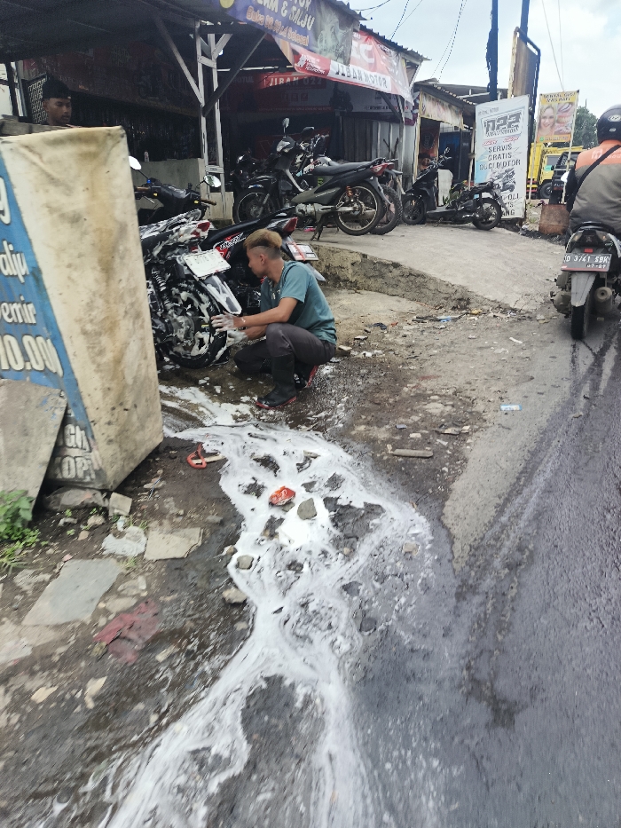 - "A man squats washing a motorcycle with soapy water, which is running onto the street" by FM-x3nfq1, licensed under CC BY 4.0