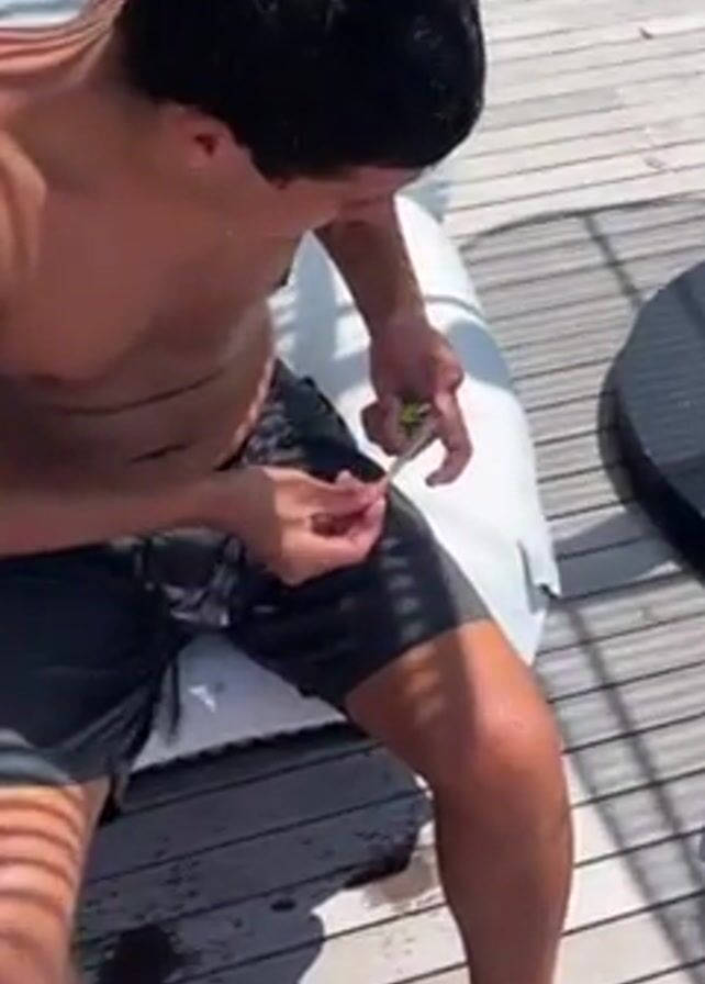 A shirtless person sitting on a cushion on a wooden deck lights a rolled cigarette or joint with a green lighter