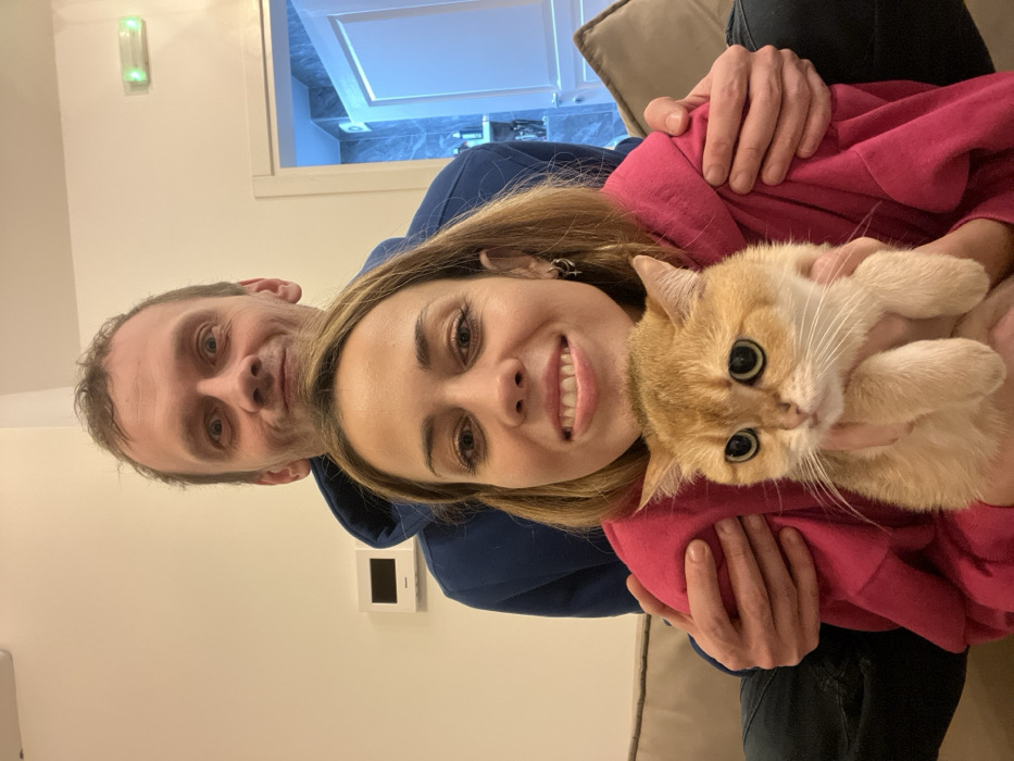 A selfie-style image presents a man, a woman, and a cat. The woman, centered, smiles broadly, holding the orange cat who stares directly at the camera. The man is partially visible on the left, also smiling. They appear to be indoors, a white wall visible behind them. A light fixture and a window frame are also in view. The woman and cat are partially obscured by pink fabric, while the man wears a blue hooded sweatshirt. A neutral colored couch cushion is in the bottom right.