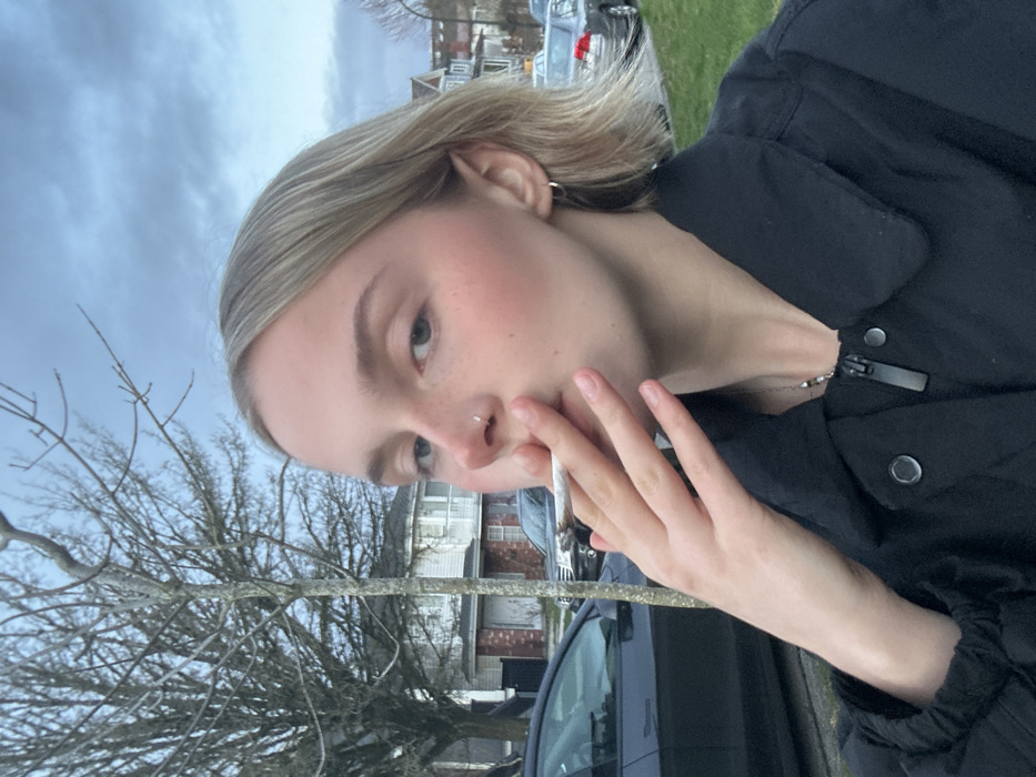 A young adult female is depicted in a chest-up portrait shot on a residential street in Vancouver, Canada. She has light skin, short blonde hair, and light-colored eyes, with a small silver stud piercing her right nostril. Her cheeks show a faint reddish flush. She wears a black collared jacket with a visible zipper and two snap buttons. A thin silver chain necklace is visible around her neck. Her right hand, with light-colored nails, holds a lit cigarette or hand-rolled joint between her thumb and index finger, positioned near her mouth. She maintains a direct gaze towards the camera. The background features an overcast sky with grey-blue clouds. A prominent leafless deciduous tree stands in the mid-ground to the left, indicating winter or early spring. Behind her and to the left, a two-story residential house with white siding, a dark roof, and a visible balcony is present. Its lower section appears to have a reddish-brown foundation or cladding. A dark-colored vehicle is partially visible parked on the street to the left. Further down the street to the right, additional residential buildings and a silver sedan are visible. A strip of green grass borders the street on the right side of the frame.