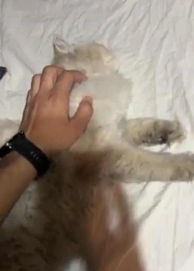 A person wearing a black sports watch is petting a long-haired cat that is lying on its back on a white, wrinkled sheet. The person’s hand is gently stroking the cat’s chest. The cat appears relaxed with its eyes closed. The background is blurred, focusing attention on the hand-petting interaction.