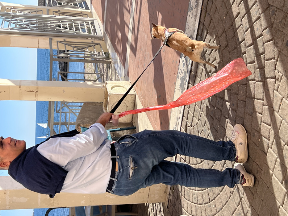 The scene depicts an outdoor promenade in Civitavecchia, Italy, under bright sunlight. A male subject, observed in profile, stands on a paved surface. He has dark hair, a light blue long-sleeved shirt, a dark blue v-neck sweater draped over his shoulders, blue jeans with a black belt, and light-colored sneakers (one displaying "U.S. POLO ASSN. 1890," the other "U.S. POLO ASSN."). He holds a black dog leash in his right hand, to which a long, translucent red plastic bag with small white dots is attached or held concurrently. A small, light brown dog is visible in the foreground, attached to the leash via a dark harness, facing away from the viewer. Its tail is raised, and its rear legs are slightly bent. The immediate environment features a walkway composed of reddish-brown square pavers arranged in a curved pattern. To the right, stone pillars support an overhead structure, with a metal railing visible beyond them. In the background, a clear blue sky meets the horizon of a calm blue sea, where two small sailboats are visible in the distance. Strong shadows are cast on the ground, indicating direct overhead sunlight. A light blue chair and a white table are partially visible to the far left.