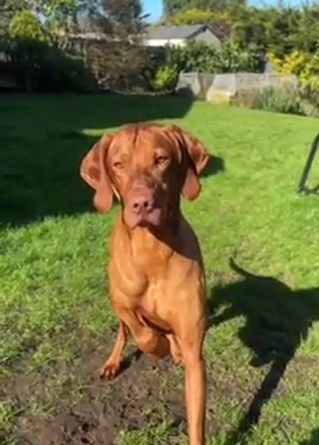 A medium shot shows a reddish-brown dog standing on a concrete patio, looking at the camera
