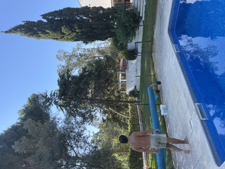 This image captures an outdoor residential scene in the city of Almada, Portugal, under clear, bright blue skies. The foreground features the corner of a rectangular swimming pool, tiled with blue mosaic and filled with clear, reflective water. Light-colored, square paving stones surround the pool. A male individual, seen from behind, stands barefoot on the paving stones, facing away from the pool. He is bare-chested and wears light-colored swim shorts. To his right, a blue, rolled-up pool cover rests on a wheeled roller mechanism on the paving, with two white buckets positioned next to it. Behind the paving, a manicured green lawn is visible, separated by a low green metal fence. The mid-ground and background are densely vegetated with various trees, including tall, slender cypress-like trees on the right and broader pines and deciduous trees elsewhere. Architectural elements in the mid-ground include a white concrete retaining wall or terraced structure, a white concrete pergola, and a small wooden cabin with a red roof, partially obscured by foliage. A multi-story white residential building with dark windows and an exterior lantern is partially visible on the far right, behind the trees and bushes.
