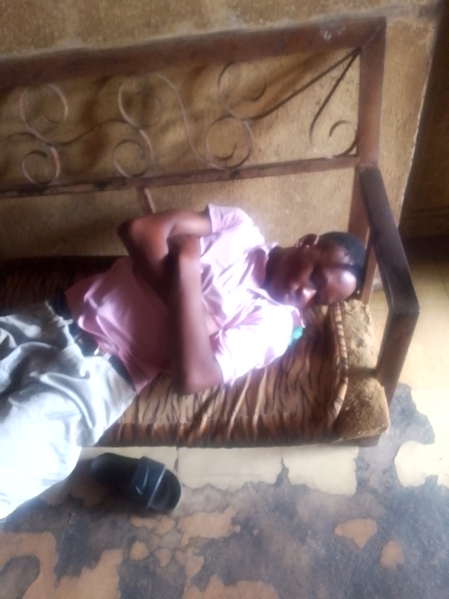 A person is lying on a metal-framed daybed. The person is wearing a pink shirt and has dark hair. The daybed has a patterned cushion, and a gray blanket is partially covering the person. A black sandal is on the floor. The floor appears to have a damaged or worn surface. The location is Unknown, Unknown.