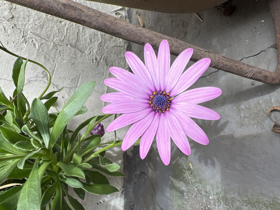 The image presents a close-up view of a single, vibrant purple-pink daisy-like flower, likely an African Daisy (Osteospermum), with a prominent dark blue central disc surrounded by a ring of small yellow florets. The flower, featuring approximately fifteen petals, is positioned slightly below the center of the frame. To the upper left, green foliage belonging to the same plant species is visible, including one unopened purple bud. The upper background consists of a textured, light grey stucco or concrete wall exhibiting minor surface irregularities. A rusted, dark brown metal object, possibly a garden stake or part of a structure, extends vertically along the right edge of the frame, partially obscuring a terracotta-colored pot on the far right. The ground surface in the lower portion of the image is grey concrete, displaying areas of moisture and faint cracks. This scene is situated in an outdoor patio or garden environment within the city of Bogota, Colombia. No individuals or animals are present; no explicit actions or interactions are depicted. The lighting is consistent with natural daylight.