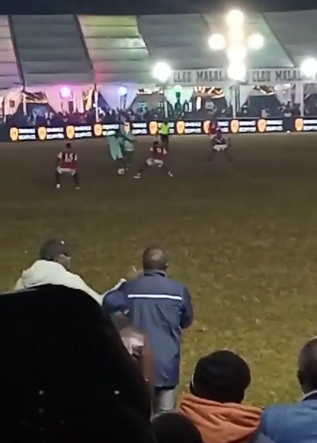 soccer game being played at night on a grassy field. Several players in red and white jerseys are running around the field. There also appear to be players in green jerseys. There are bright stadium lights illuminating the field. Behind the field, there's a large tent structure with banners that read "CLEO MALALA" alongside other imagery. There are numerous spectators watching the game. The camera seems to be held by someone in the crowd, focusing on the action on the field. The overall atmosphere is lively with the excitement of the game.