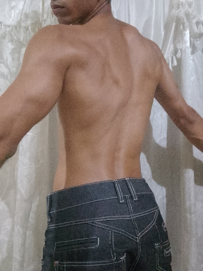 A partial rear view photograph displays an individual, appearing male, shirtless from the waist upwards, revealing a muscular back and shoulders with medium-brown skin tone