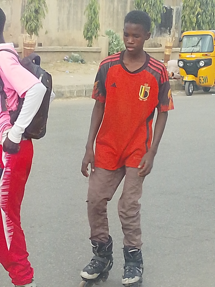 A young person on roller blades wearing an orange and black Belgium soccer jersey stands on a gray asphalt road. They also wear brown pants. Another person wearing a pink shirt, white undershirt, red pants, and a black backpack stands on the left. In the background, there is a yellow tricycle taxi with the number 6311 on its side and some green trees. There's a concrete building facade with a few plants.