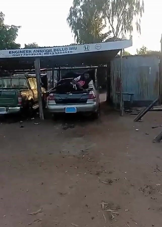 man lying across the back of a silver Toyota car. The car is parked near a shed, and the license plate of the car is visible. The man is wearing a black shirt with a pink logo, black pants, and no shoes. He looks up and to the side at one point. The surroundings appear to be a dusty or dirt-covered area, possibly a repair shop or garage. A green truck is visible in the background under the shed. The video quality is somewhat shaky.